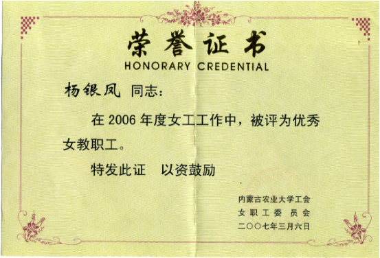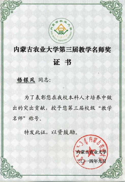 杨银凤教授教书育人、无私奉献,爱岗敬业,是学生心中的严师、良师和好友。她精心备课,认真组织课堂教学,致力于改革创新课堂教学模式,采用多样化教学方法与手段,引导学生热爱课堂,在学习中收获知识,其教学水平和效果获得师生一致好评。她在教学、科研工作中不断改革创新,为提升教学水平、培养人才作出了突出的贡献。