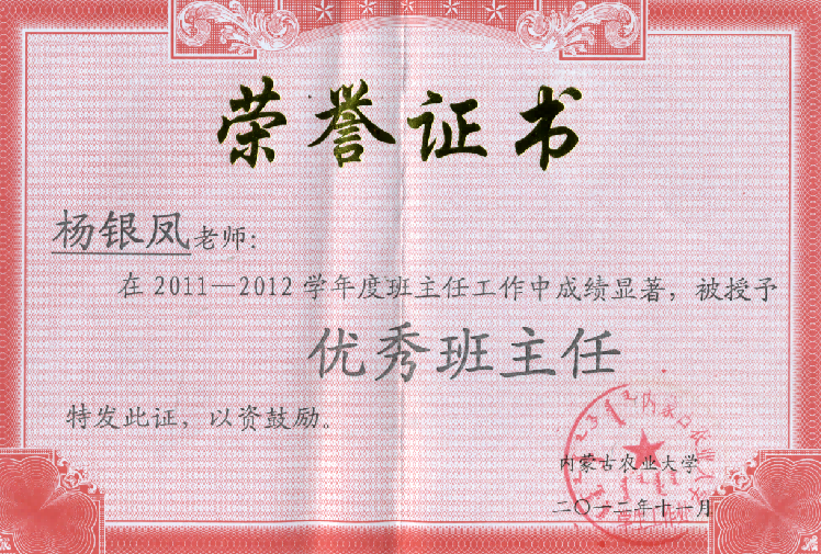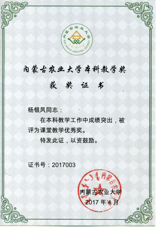 我在教学过程中,针对不同专业不同层次的学生因材施教,善于改进教学方法,引导学生会学乐学。在课堂教学中,重点突出、思路清晰,灵活运用教具和教学多媒体,将形象讲授与书本结合,在讲授过程中声音洪亮,具有较强的感染力,教学效果良好,受到了学生们的一致好评。我主持申报的“家畜解剖学”课程于2011年被评为内蒙古自治区级“精品课程”,我于2014年被学校授予“教学名师”光荣称号,于2017年被学校评为“课堂教学优秀奖”。
