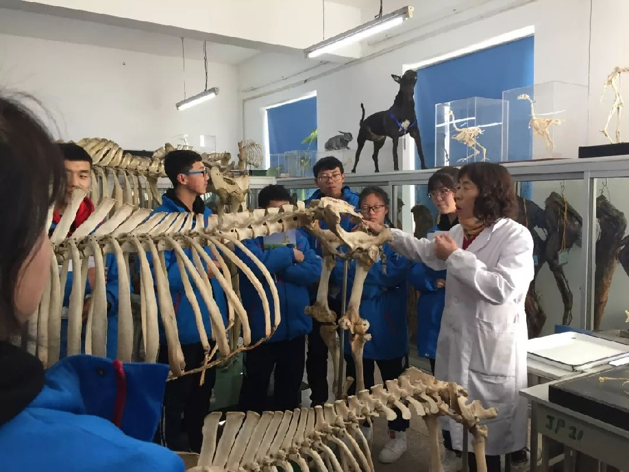 为加强畜牧兽医理论与实践的结合,我们为呼市第十一中学牧医专业学生开展了实训教学。同学们对照课本上的讲解图,认真观察实体标本;我们结合骨骼标本和冻干标本向同学们系统讲授畜牧类动物的肌肉及骨骼的名称、位置。正所谓“夫耳闻之,不如目见之;目见之,不如足践之;足践之,不如手辨之”,通过耳闻—目见—足践—手辨的对比、学习,同学们不仅理论知识得到了丰富,实践能力更是得到了提升。