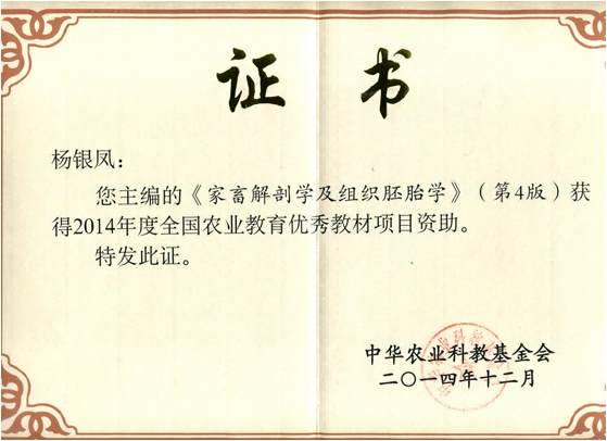 在做好教学的同时,我还积极参加教材建设。主编了全国高等农业院校“十一五”和“十四五”规划教材《家畜解剖学与组织胚胎学》第四、第五版(2011年、2024年),并于2014年被中华科教农业基金会评为全国农业优秀教材奖。此外,我还主编了“十三五”规划教材《家畜解剖学实习图》(第二版)。