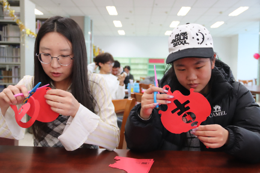 在“剪纸纳福”活动区,参与者们纷纷动手,投入实践。有的选择剪制经典的“福”字,有的尝试雕刻精美的窗花,经过精心创作,一张张普通的红纸在大家的指尖幻化成一幅幅精美的剪纸作品,有寓意吉祥的“年年有余”,有憨态可掬的生肖马。春节剪纸寓意着辞旧迎新、吉祥如意,常见的图案有福字、窗花、生肖、花鸟等,每一种图案都有其独特的美好寓意。期望通过此类活动,让更多年轻人了解并喜爱非遗,让传统技艺在校园中薪火相传。