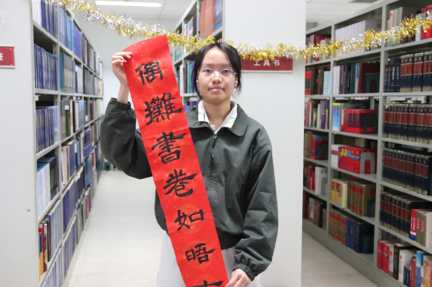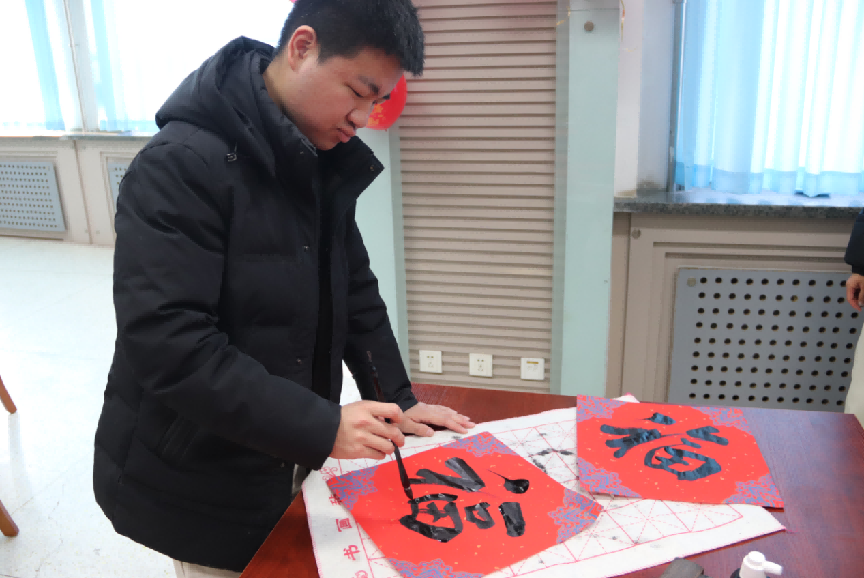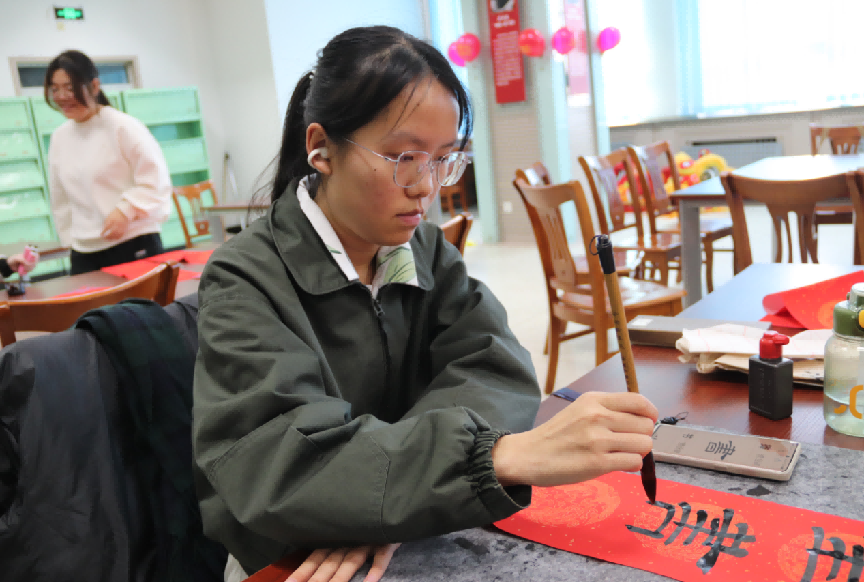 “墨香添福”活动桌前人头攒动,笔墨飘香,气氛热烈。书法协会的同学们铺开红纸、研好墨汁,为师生书写福字与春联,字里行间满溢着对家乡的思念与祝福。有的同学挥毫泼墨,一气呵成;也有初学乍练的同学认真临摹,一笔一画尽显专注。“马年瑞气迎新春,农苑书香育英才”“春回大地千山秀,福降人间万户欢”。一副副寓意吉祥的春联,一个个饱满圆润的福字,满载着大家对新年的美好期盼。学生们纷纷带着刚写好的作品,在图书馆的新春背景墙前合影留念。