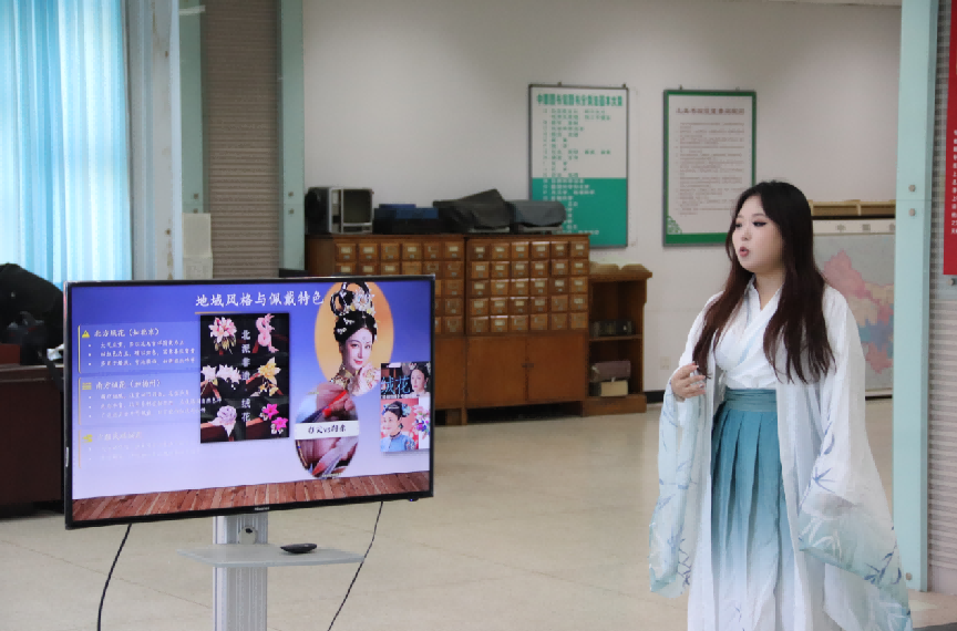 在“非遗焕彩贺新岁”环节中,非遗绒花介绍人通过图文展示与现场讲解,为师生揭开绒花的神秘面纱。绒花谐音‘荣华’,是我国传统手工艺品中的瑰宝,距今已有两千多年历史,明清时期更是成为宫廷贡品与民间婚嫁、节庆的必备装饰。 介绍人从绒花的历史渊源娓娓道来,详细介绍了其“以绒为料、以线为骨”的制作工艺,着重讲解了绒花“轻、薄、透、亮”的艺术特点与“吉祥富贵、福寿绵长”的文化寓意。现场展示的红绒福字、梅花枝、生肖造型等新春主题绒花作品,色彩艳丽、造型精巧,引得师生纷纷驻足观赏,近距离感受非遗工艺的细腻与灵动。
