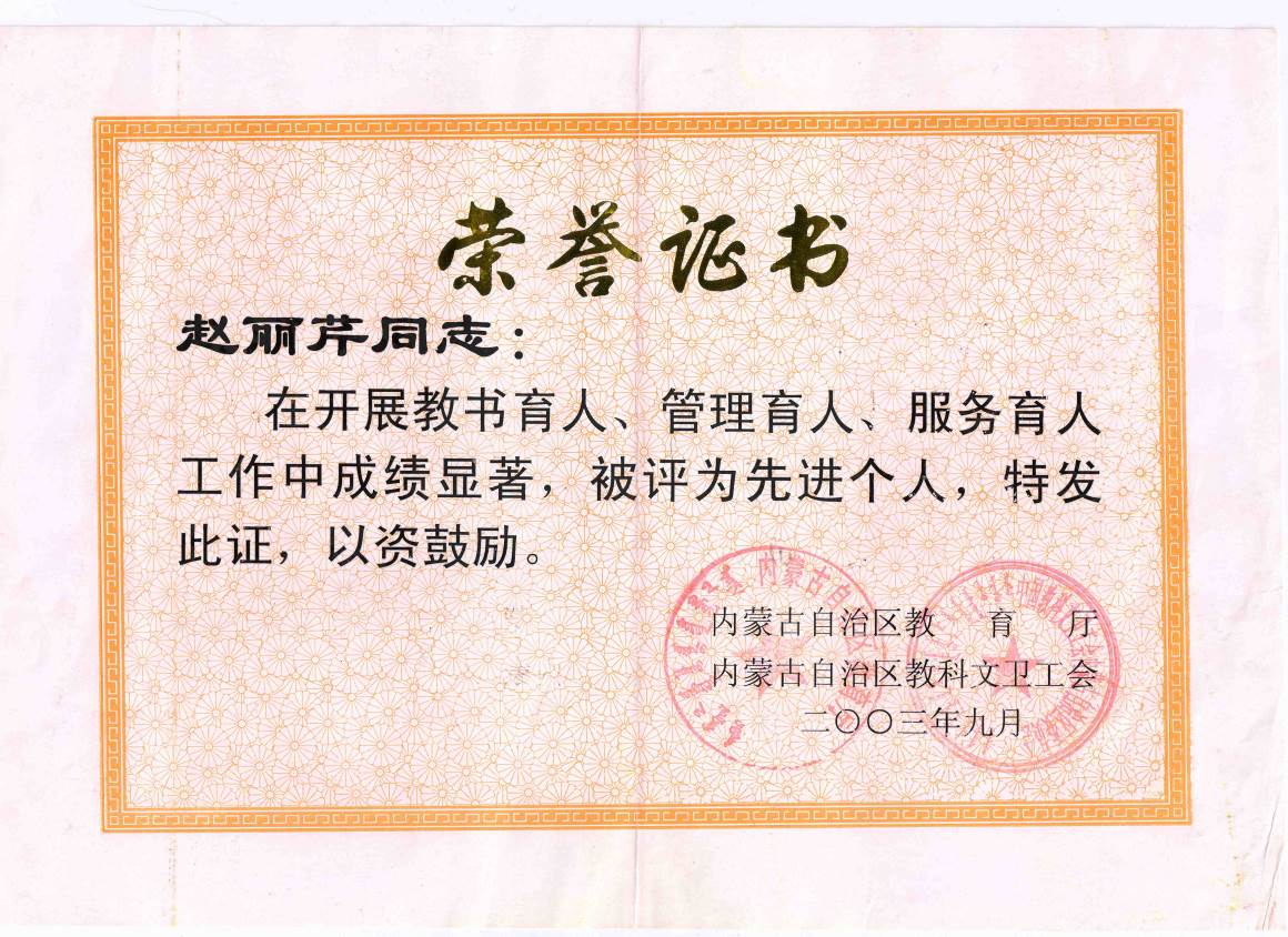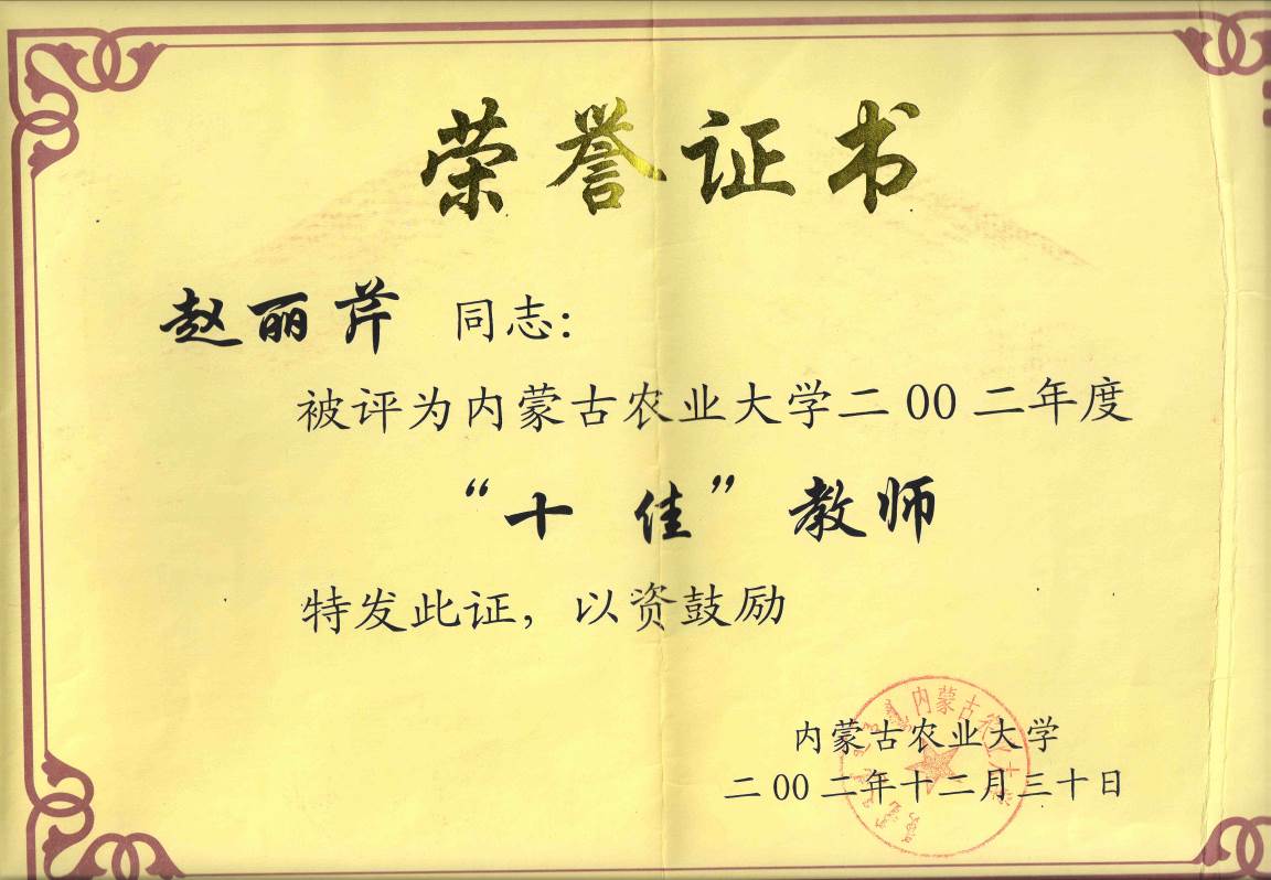 1998年、2001年主讲的“果蔬贮运学”和“果蔬加工学”分别被内蒙古农业大学评为“优秀课程”;1990获内蒙古农业大学“教学、科研、实践三结合”奖;1994年获内蒙古农业大学“教学优秀奖”;1999年获内蒙古自治区“科教兴农奖”;2000年获内蒙古农业大学“教学成果二等奖”;2002年获内蒙古农业大学“十佳”教师;2003年获内蒙古自治区“教书育人先进教师”;2004年获“全国师德先进个人”;2008年获内蒙古农业大学本科教学工作水平评估“以评促建先进个人奖”;2009年获内蒙古农业大学“组建十年工作突出贡献奖”;2013年获内蒙古农业大学“教学成果一等奖”等多项奖项。