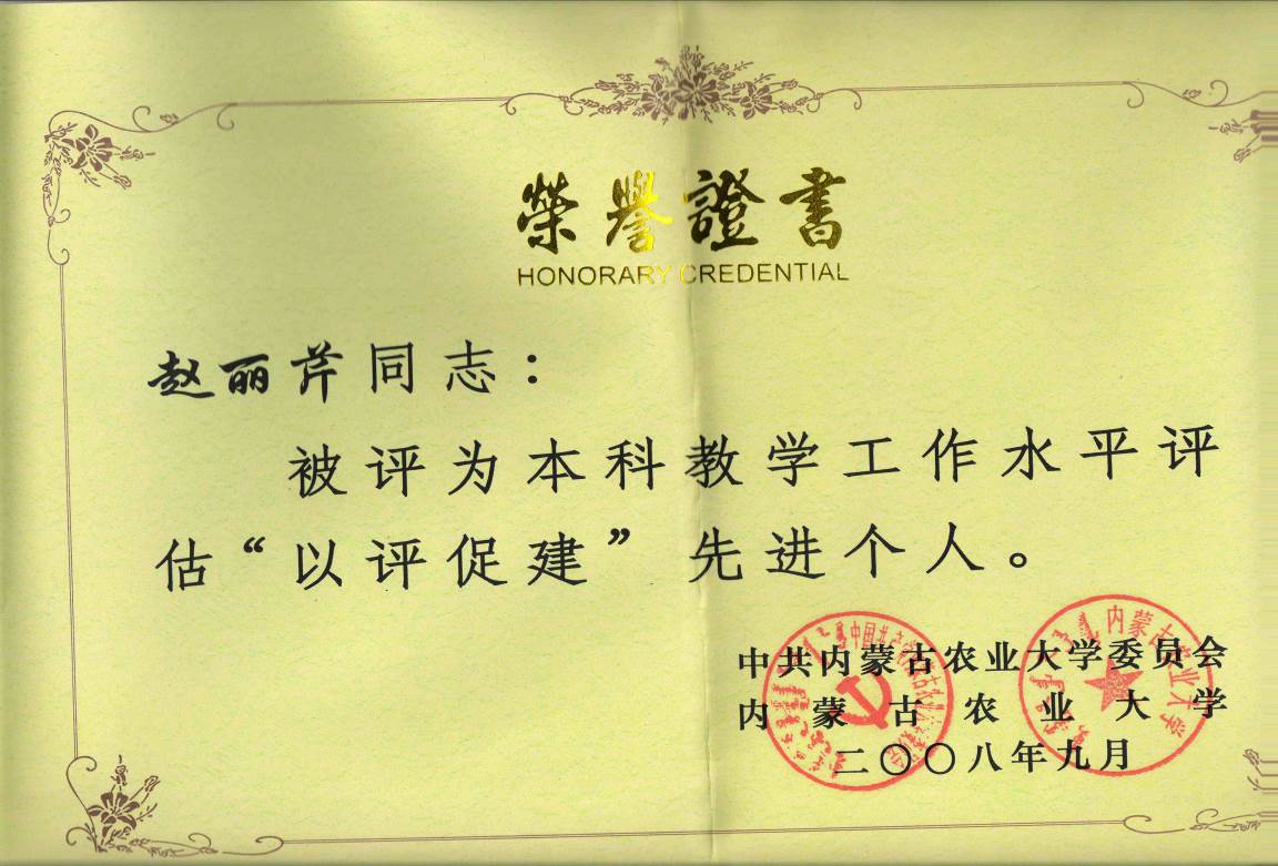 2005年学位点申报成功的喜悦尚未散去,我便又立即投入到迎接教育部2008年本科教学评估的紧张筹备中。自2006年起学院全面进入迎评状态,这场持续近三年的“攻坚战”,也成为我职业生涯中最繁忙、最充实,也最具意义的阶段。当时恰逢院长出国做访问学者期间,学院的教学管理、学科建设与研究生工作重担自然落在我肩上。白天我如陀螺般辗转于各类会议之间,部署迎评任务,协助教学秘书完善教学档案,恢复已中断多年的工艺教学生产实习,处理数不清的事务性工作;夜晚则伏案撰写学院自评报告、编写教材、修改学生论文、整理科研项目材料……,多重任务交织叠加,身心几近极限,却始终未曾退缩,因为我有幸与一支同心同德、充满温情的团队并肩同行。乌兰书记统筹全局、凝心聚力;范贵生、张和平两位副院长分工协作、主动补位;李崇副书记全力保障学生工作与思政育人环节及综合治理等工作。全院领导班子团结默契,为迎评工作提供了坚实保障。更令我感动的是,所有教研室主任、实验室主任和一线教师无一例外地全力以赴,大家都以高度的责任感任劳任怨、加班加点、不计得失,全院上下拧成一股绳。在此过程中我亲自撰写申报材料,并借迎评契机将我院“食品科学与工程”本科专业申报成功为内蒙古自治区品牌专业,显著提升了专业的区域影响力。2008年经过全院师生共同努力,学院顺利通过教育部本科教学评估,学校获评“良好”,学院的各项教学工作也得到了专家组的高度肯定,同年我荣获学校“本科教学工作水平评估‘以评促建’先进个人”称号。