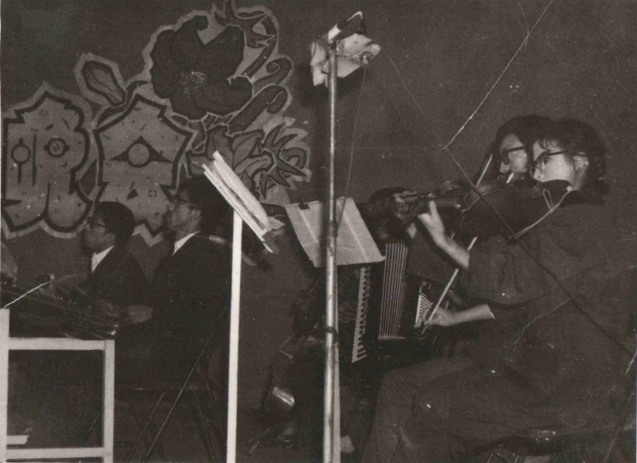 大学时期在舞台上伴奏的学生乐队(赵丽芹右一)