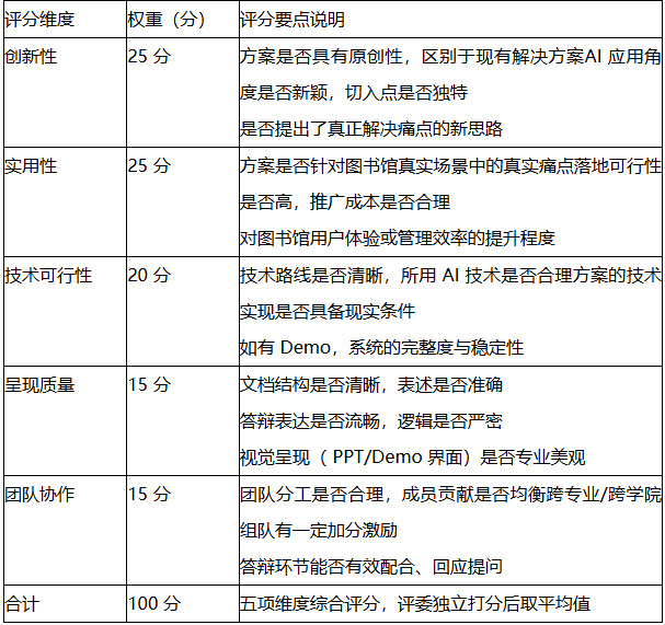 评审委员会由图书馆专业人员、信息技术专家及相关学科教师组成。评审遵循公平、公正、公开原则, 以作品实际质量为唯一标准,按以下五个维度进行综合评分,总分 100 分。