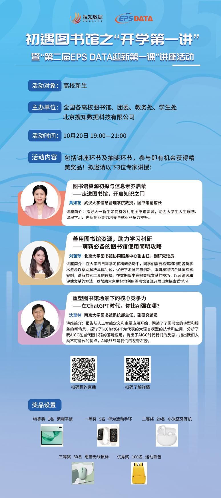 北京搜知数据科技有限公司携手全国高校,共同发起初遇图书馆之“开学第一讲”暨“第二届EPS DATA迎新第一课”活动。旨在通过权威引领、深度互动与价值激励,助力新生洞悉图书馆的育人真谛,掌握数字时代的信息生存法则,点燃终身学习的火种。活动包括讲座环节及抽奖环节,参与即有机会获得精美奖品!