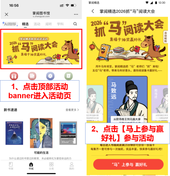 在书城主页顶部轮播图找到2026抓“马”阅读大会活动banner,点击进入活动页后再点击底部【“马”上参与赢好礼】按钮即可参与活动。