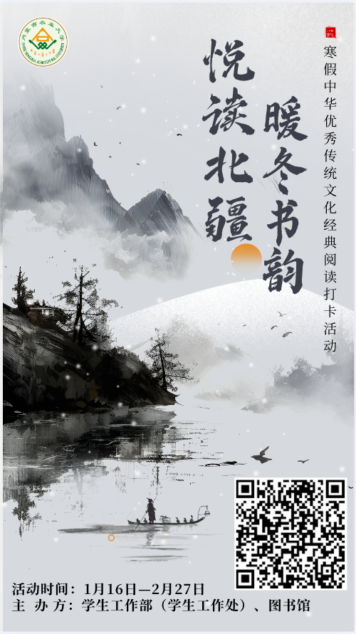 冬雪飘飖处,书韵正当时。寒冬时节,正是我们于喧嚣尘世中寻得一方宁静,涵养心性、沉潜阅读的黄金时光。为推动校园阅读风尚,传承文化薪火,引领广大同学在寒假期间潜心经典、对话传统、滋养心灵,学生工作部(学生工作处)、图书馆联合举办“悦读北疆·暖冬书韵”寒假14天中华优秀传统文化经典阅读打卡活动。我们诚邀全校学子暂离尘嚣,携手步入书香世界,共赴一场温暖而深邃的冬日阅读之旅。