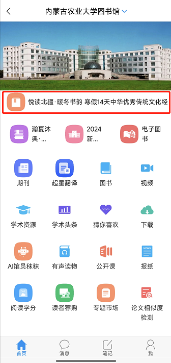 或点击“学习通”APP首页右上角“邀请码”,输入:nmgndtsg(内蒙古农大图书馆首拼),即可看到活动页面。