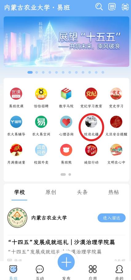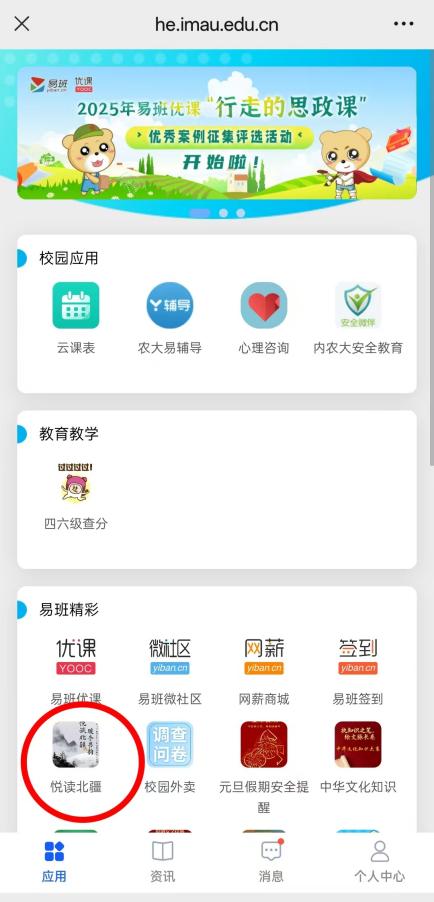 1.打开易班APP或通过“IMAU小禾”服务号进入“我的易班”,首页选择“悦读北疆”轻应用。