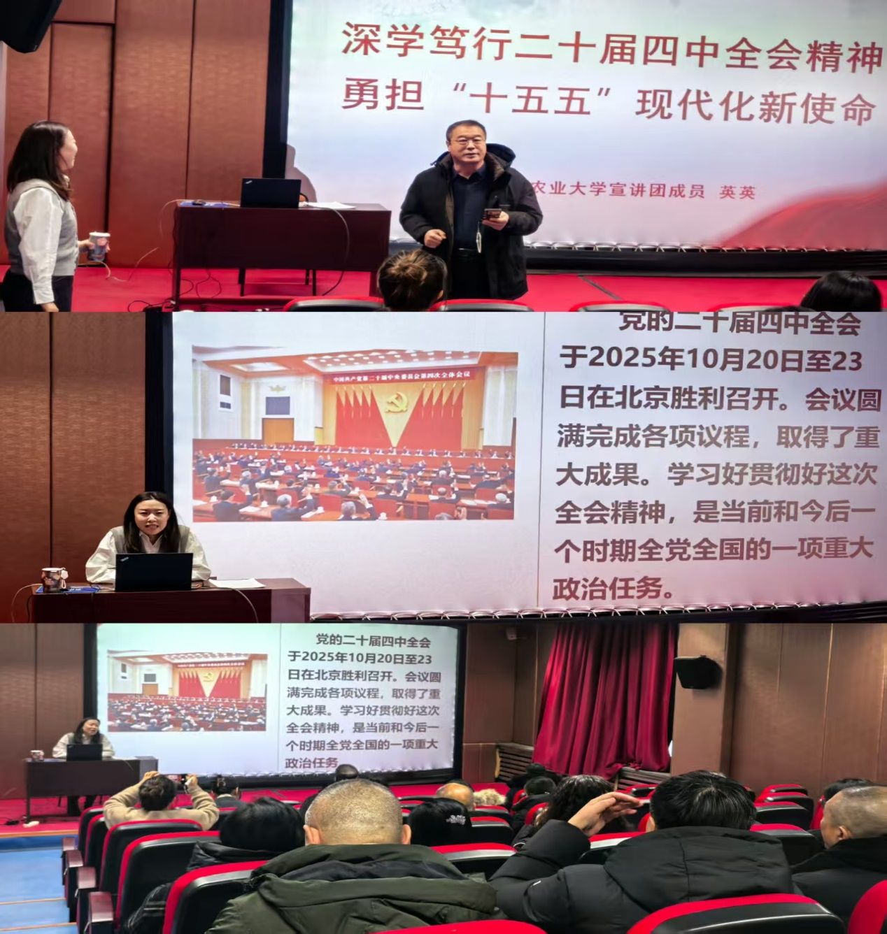 宣讲中,英英讲师以“深学笃行二十届四中全会精神 勇担‘十五五’现代化新使命”为主题,围绕党的二十届四中全会公报核心内容,系统解读了全会提出的“统筹教育强国、科技强国、人才强国建设”“加快高水平科技自立自强”等重大部署。结合“十五五”时期作为基本实现社会主义现代化关键阶段的战略定位,英英讲师深入阐释了全会精神对高校事业发展的指导意义。